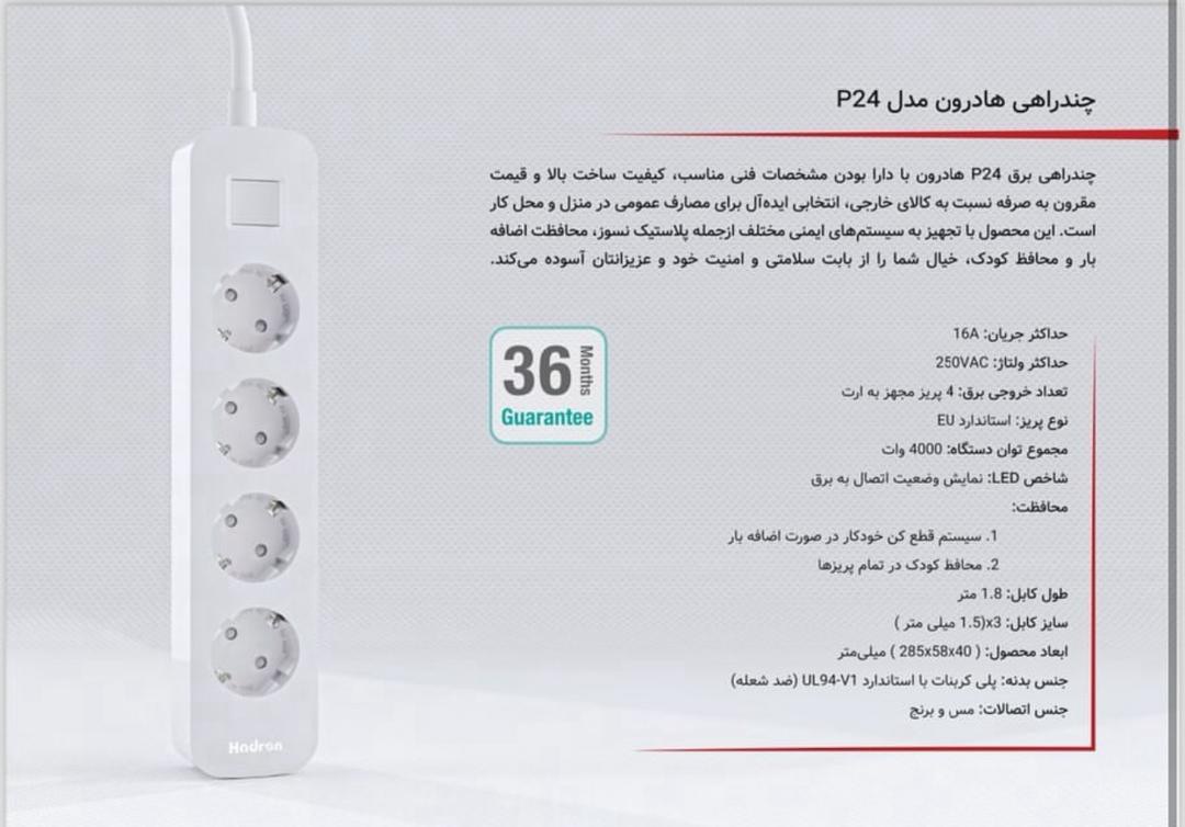 جندراهى برق P24 هادرون با دارا بودن مشخصات فنى مناسب، کیفیت ساخت بالا و قیمت مقرون به صرفه نسبت به کالاى خارجى، انتخابى ایده ال براى مصارف عمومى در منزل و محل کار است. این محصول با تجهیز به سیستم هاى أیمنى مختلف ازجمله بلاستیک نسور، محافظت اضافه بار و محافظ کودى، خیال شما را از بابت سلامتى و أمنیت خود و عزیزانتان أسوده مى کند.